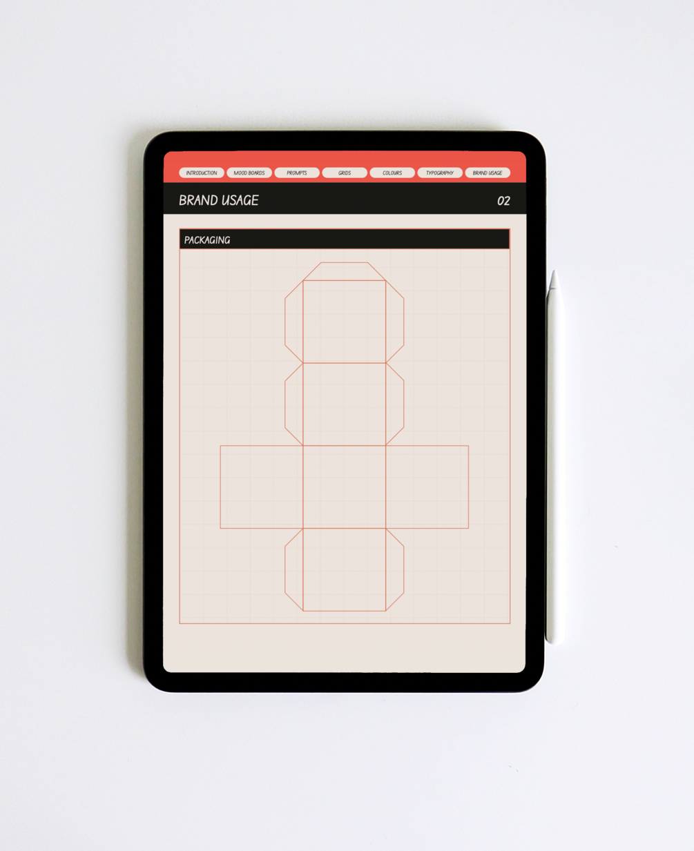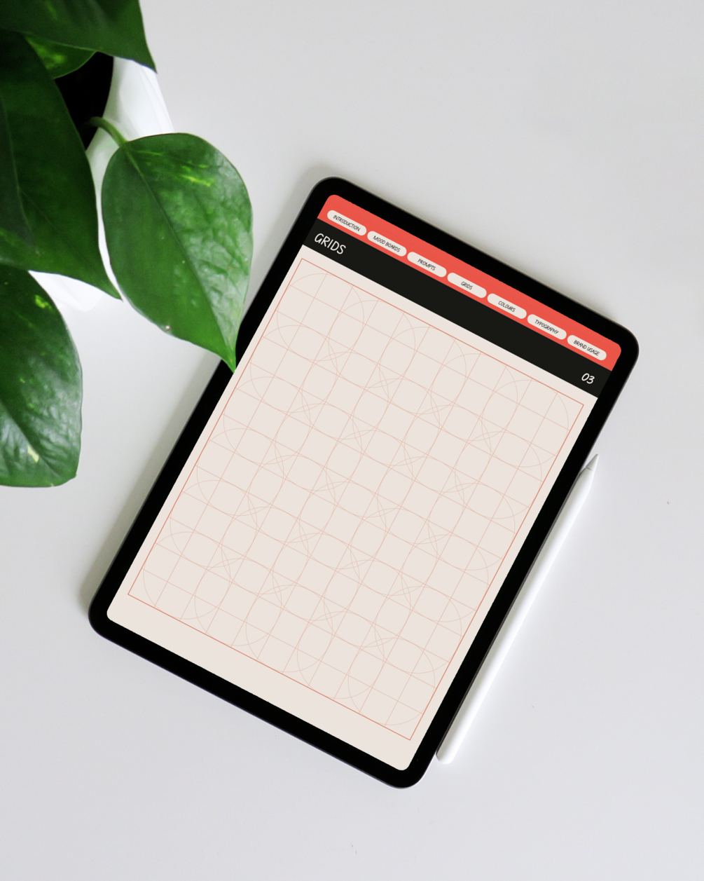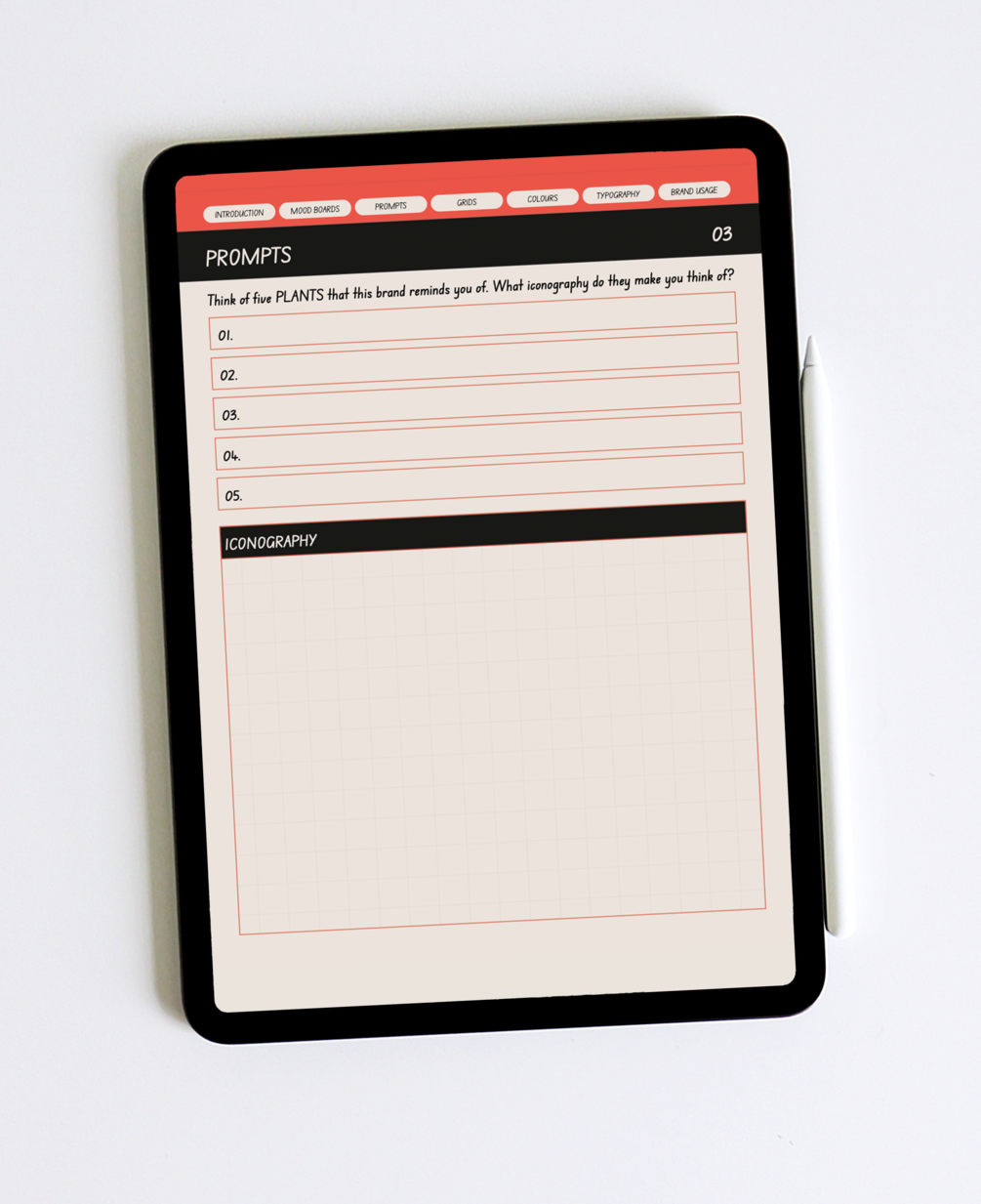 An interactive PDF to be imported into GoodNotes or other tablet-based note taking apps. Pages include PROMPTS, GRIDS, MOOD BOARDS, COLOURS, TYPOGRAPHY and BRAND USAGE.